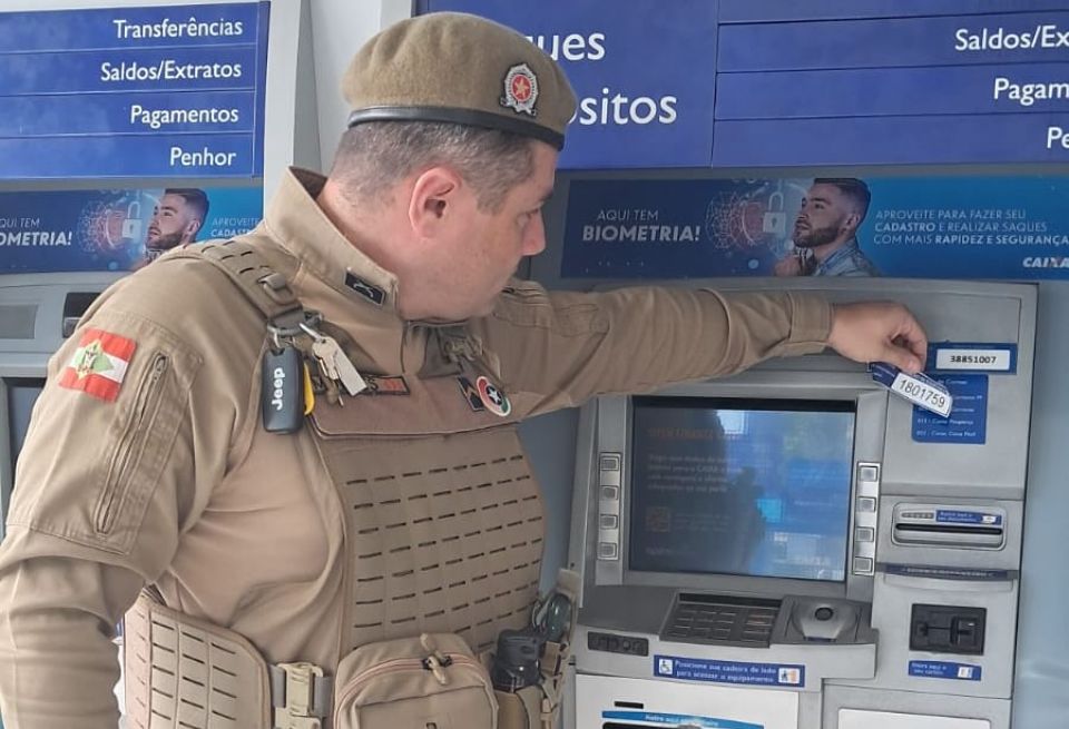 Os policiais foram acionados depois que funcionários identificaram a instalação de dispositivos para reter cartões e adesivos com um número falso de 0800, colados sobre o número de atendimento verdadeiro nos caixas eletrônicos. Segundo a denúncia, o casal havia deixado o local em um Toyota Etios em direção a Corupá (SC).