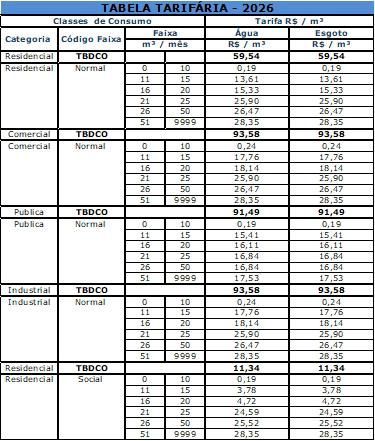 A Companhia Águas de Itapema, vem, tornar a público, que irá praticar dentro de 30 (trinta) dias do prazo da publicação desta comunicação, as seguintes tarifas e estrutura tarifária: (tabela em anexo)