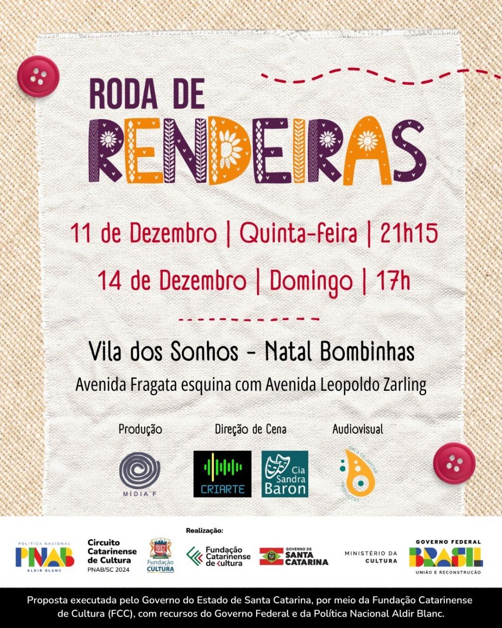 O espetáculo Roda de Rendeiras é um projeto produzido pela Mídia F, executado pelo Governo do Estado de Santa Catarina, por meio da Fundação Catarinense de Cultura (FCC), com recursos do Governo Federal e da Política Nacional Aldir Blanc.